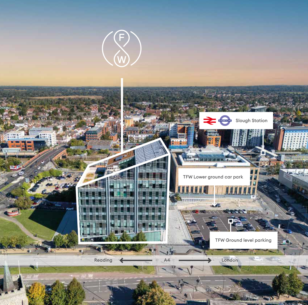 The Future Works is a state-of-the-art, Grade A office building in the heart of Slough - offering 100,000 sq ft of premium workspace designed with wellbeing and sustainability in mind, it features a stunning 3,100 sq ft rooftop terrace with Windsor Castle views, an on-site café and gym, smart building technology and best-in-class amenities.